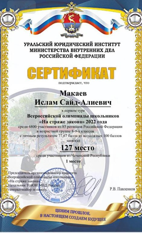12.03.2022Обучающийся 9 класса Макаев Ислам Сайд-Алиевич награжден сертификатом за участие в первом туре Всероссийской олимпиады школьников "На страже закона" 2022 года среди 6800 участников из 95 регионов Российской Федерации в возрастной группе 8-9-х классов с личным результатом 77,67 балла из возможных 100 баллов заня 127 место среди участников из Чеченской Республики 1 место