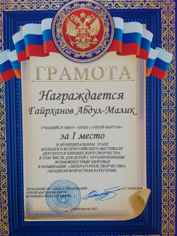 16.05.2022Обучающийся 4 класса Гайрханов Абдул-Малик занял 1 место в муниципальном этапе Большого Всероссийского фестиваля детского и юношеского творчества, в том числе для детей с ограниченными возможностями здоровья в номинации "Литературное творчество" (младшая возрастная категория)