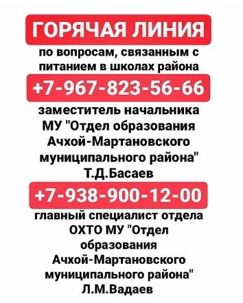 14.01.2022МУ "Отдел образования Ачхой-Мартановского муниципального района" открывает горячую линию по вопросам организации сбалансированного горячего питания учащихся в общеобразовательных организациях нашего района.