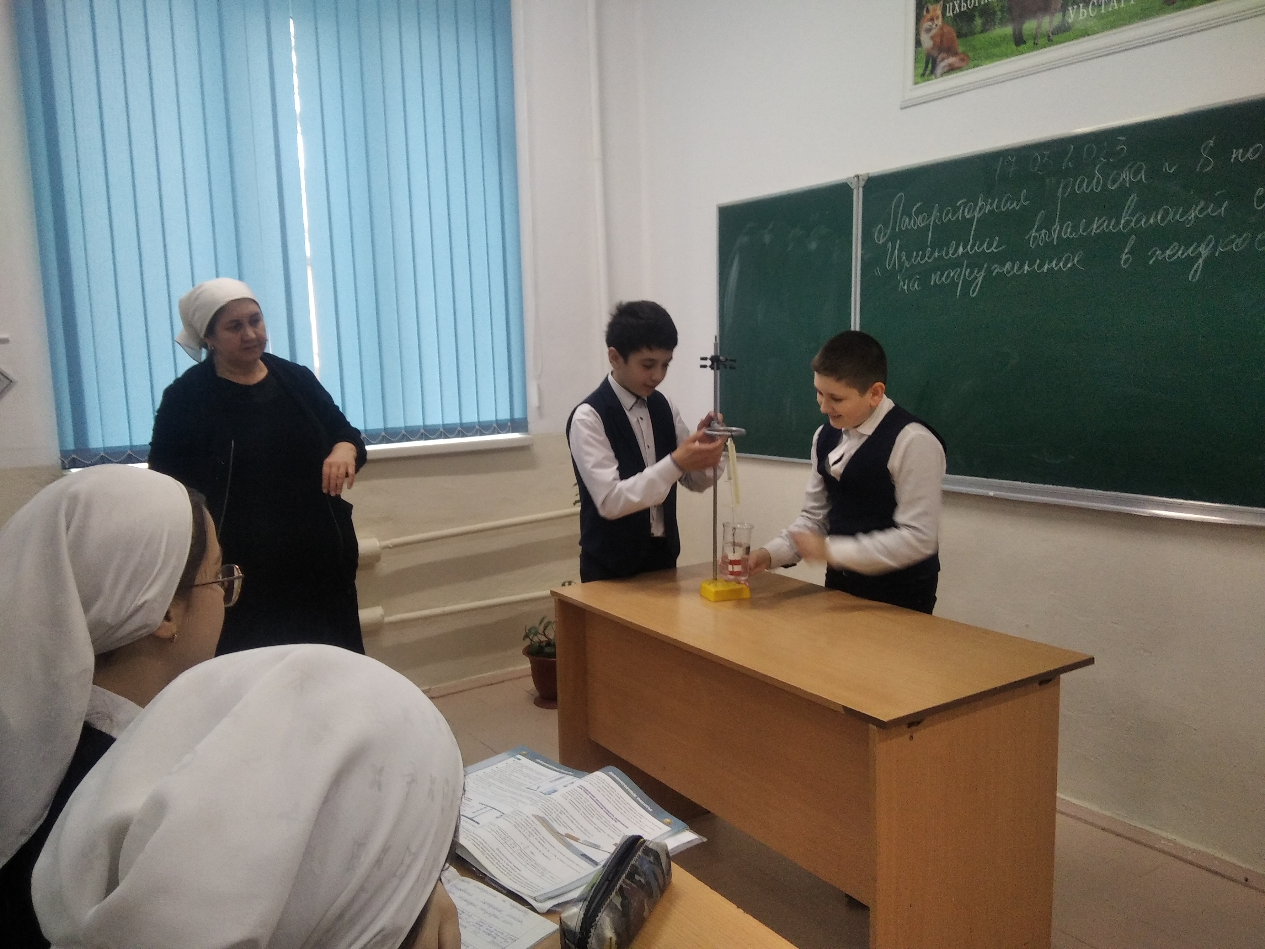 Для проведения лабораторной работы учитель использовала динамометр, штатив с муфтой и лапкой, два тела разного объема, стакан с водой и насыщенным раствором соли в воде.