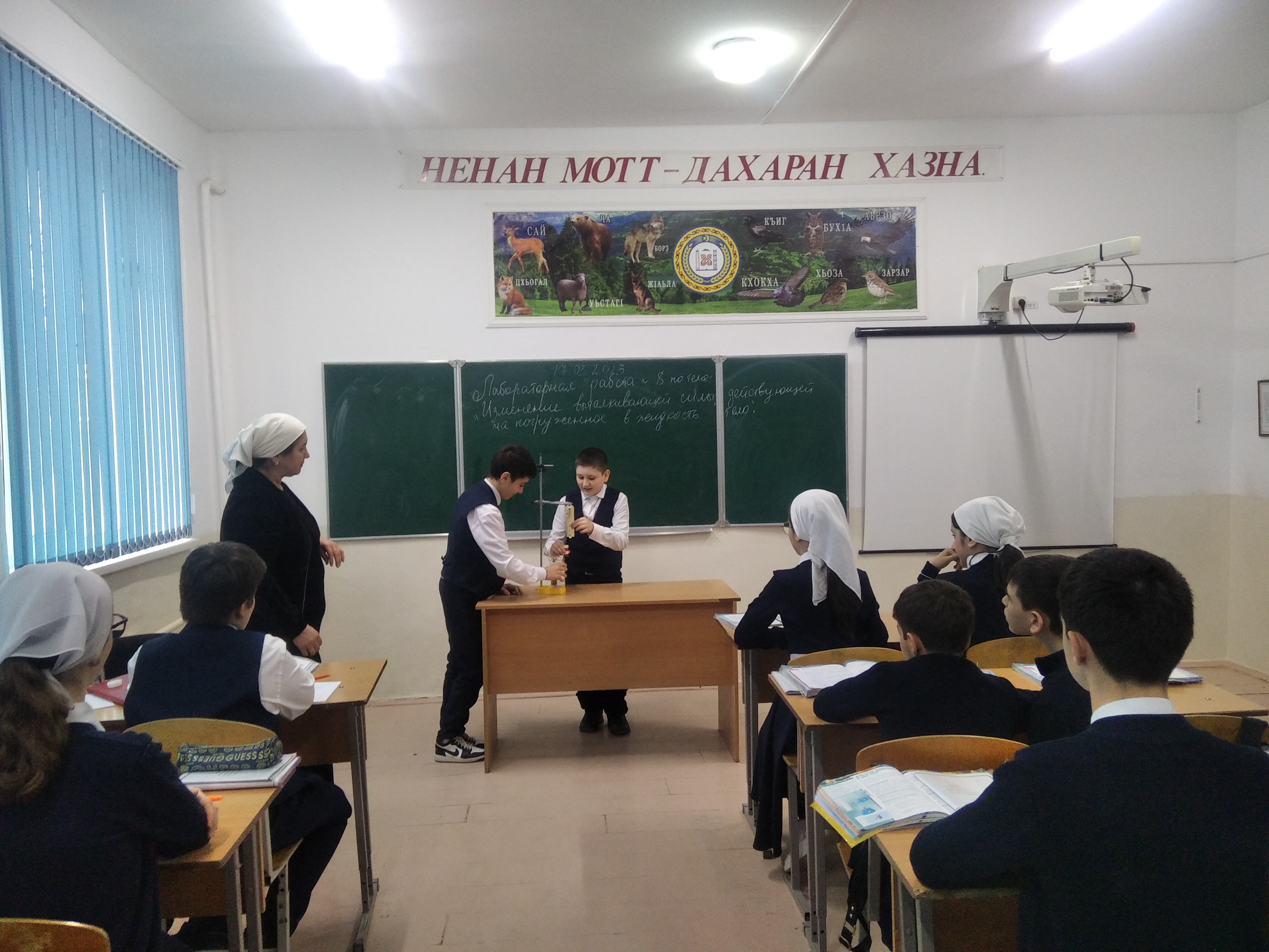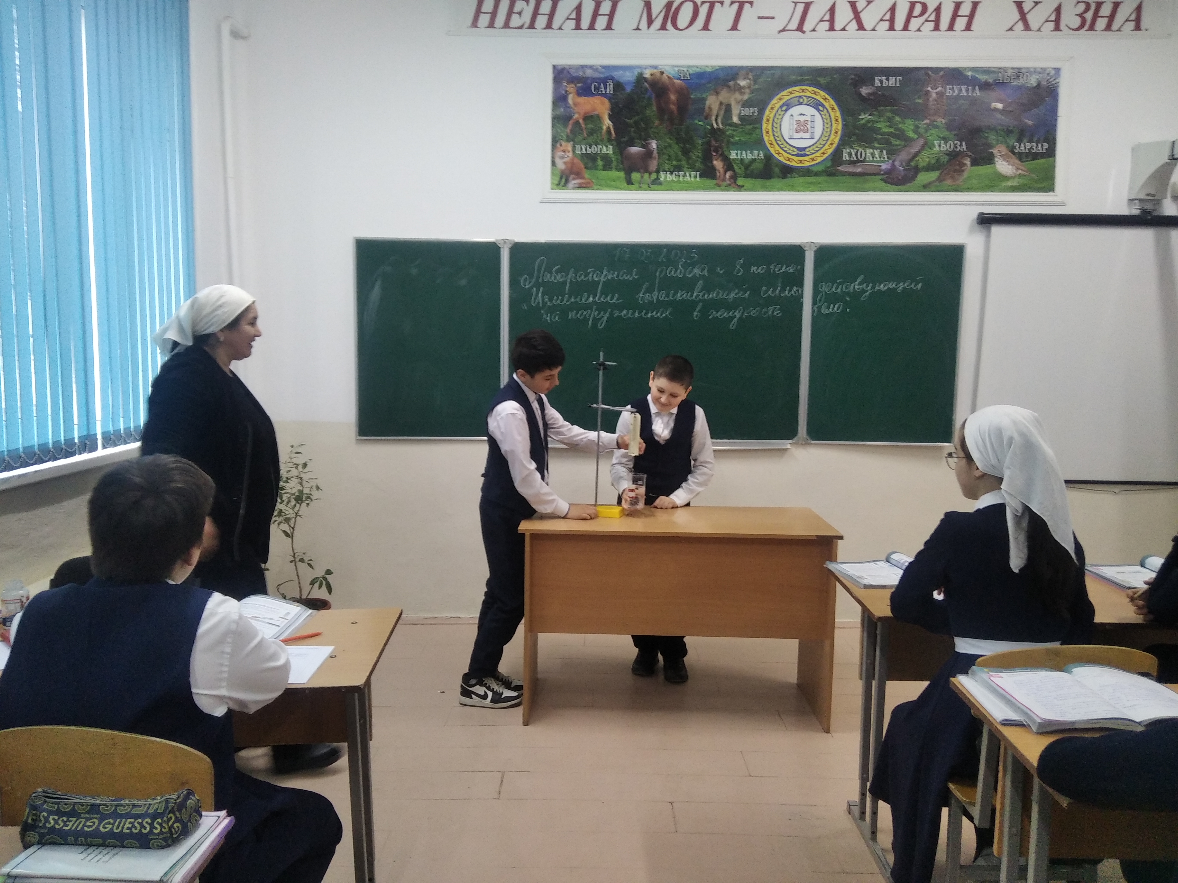 В начале урока учитель совместно с обучающимися сформулировала цели урока - опытным путем обнаружить выталкивающее действие жидкости на погруженное в нее тело и научиться определять выталкивающую силу.