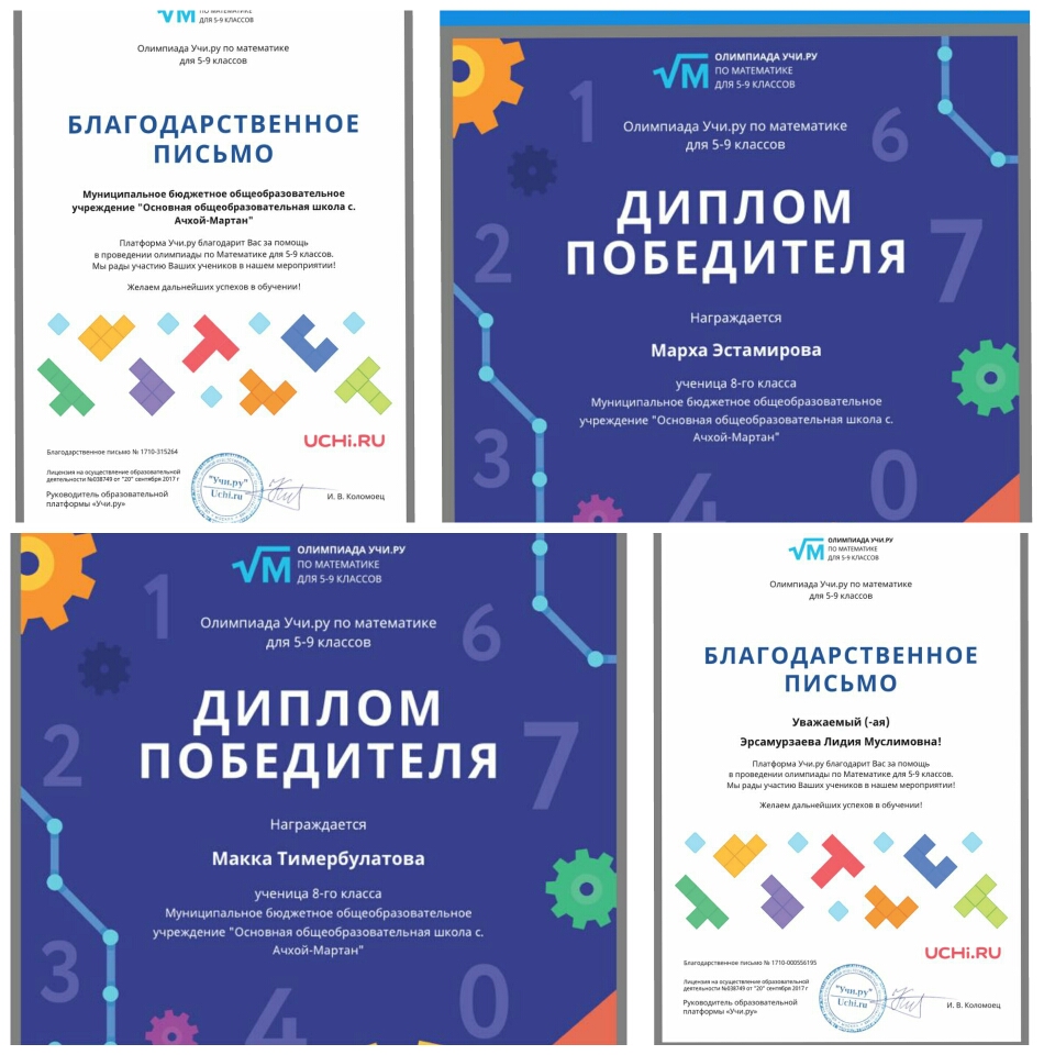 15.11.2017Обучающиеся 8 класса Эстамирова Марха и Тимербулатова Макка приняли участие в олимпиаде по математике на портале UCHi.RU и были награждены дипломами.